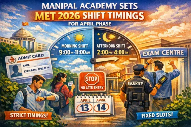 Manipal Academy of Higher Education (MAHE) has published official shift timings for the MET 2026 entrance examination, giving candidates a clear schedule to plan around ahead of the April 13 and 14 Phase 1 dates. The computer-based test will run in two daily shifts, with slot selection having already taken place through the official booking window at manipal.edu. Exam slots, once allotted, are fixed and cannot be altered.
